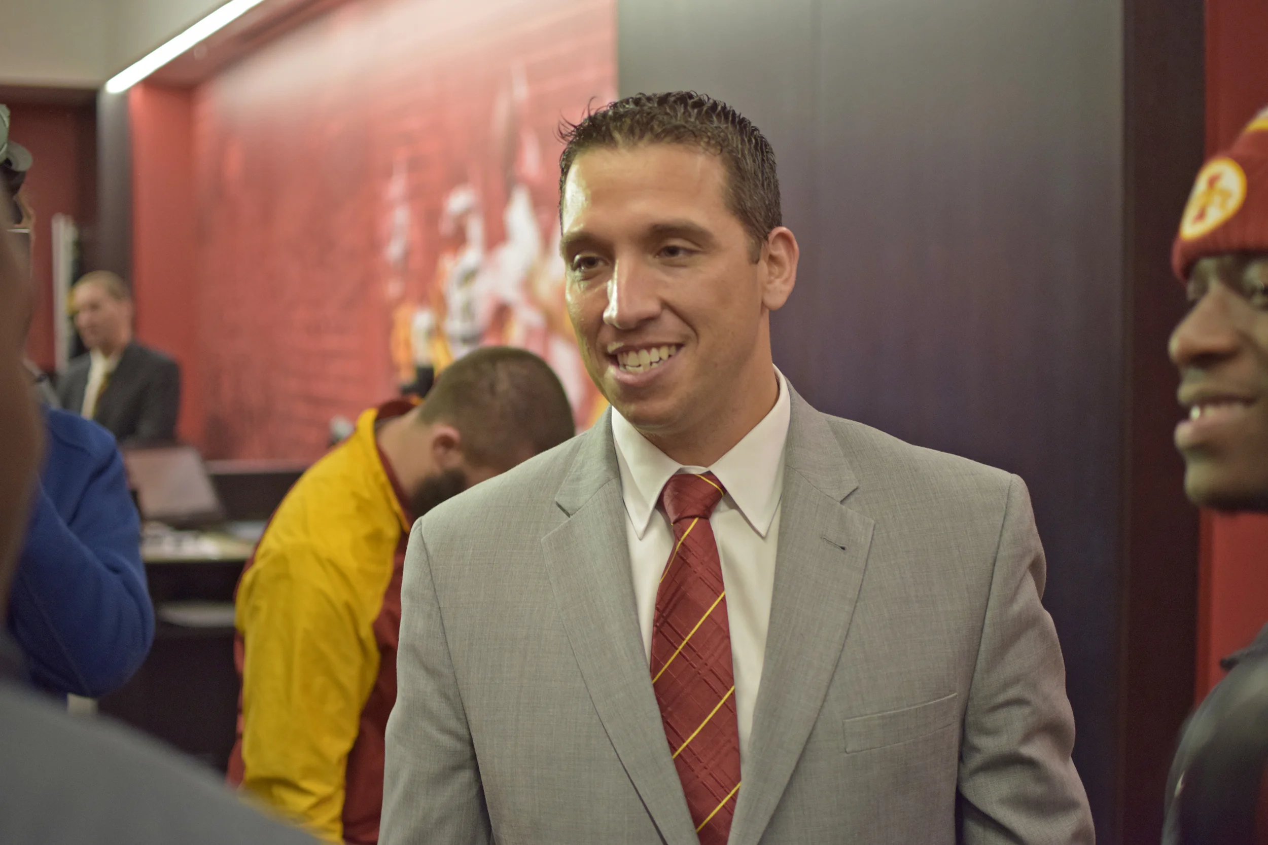 Matt Campbell meets a few players after his introductory press conference on Nov. 30, 2015 at the Bergstrom Athletic Complex in Ames, Iowa. Photo by: Ryan Young/Iowa State Daily